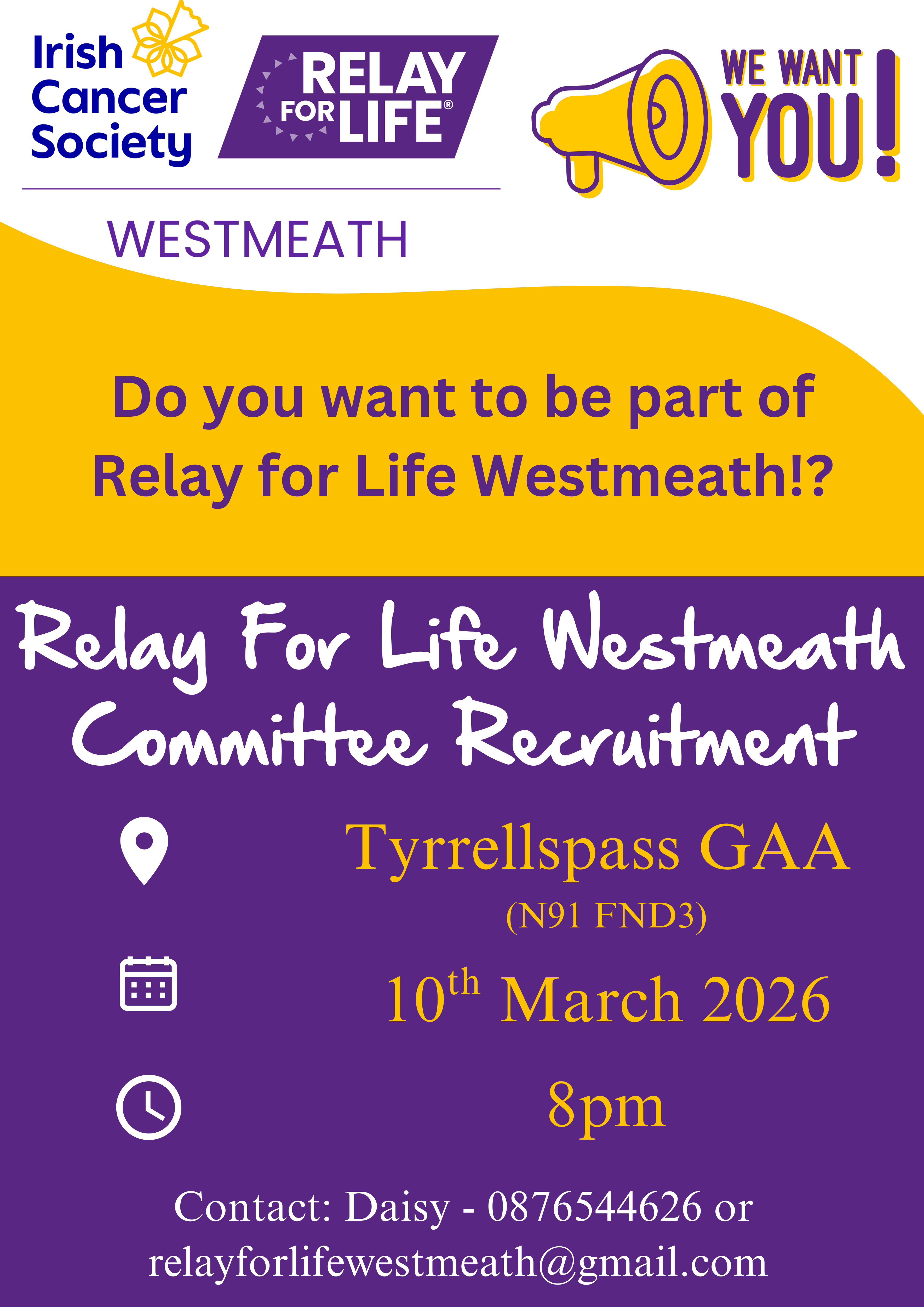 We are delighted to confirm that Relay for Life Westmeath will be at Tyrrellspass GAA Club, Mullingar Road, Tyrrellspass on 19 September 2026!